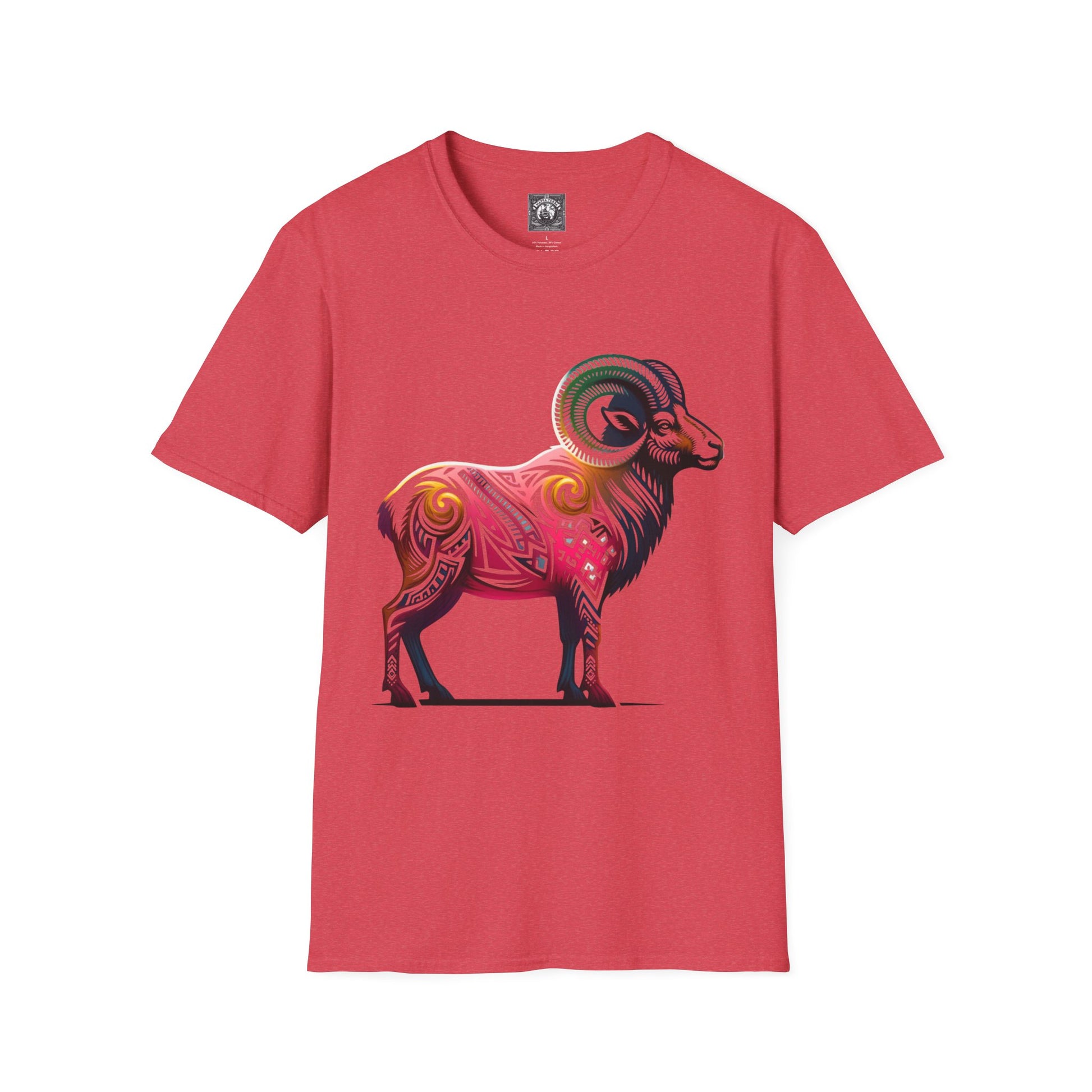 Colorful Tribal Tattoo Style Big Horn Sheep Ram Graphic T-Shirt, Stylish Animal Tee, Unisex Softstyle Shirt, Casual Wear, Birthday Gift, Zodiac Fashion